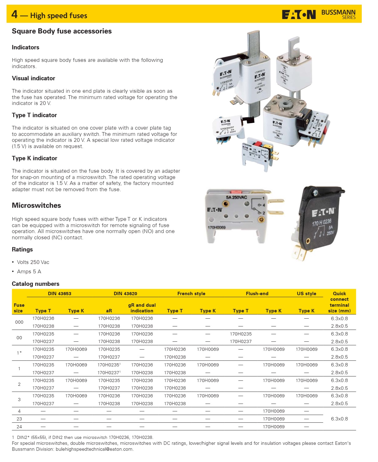 帶T型指示器或K型指示器的熔斷器均可配備遠(yuǎn)程狀態(tài)指示用的微動(dòng)開(kāi)關(guān)。微動(dòng)開(kāi)關(guān)均配有一個(gè)常開(kāi)觸點(diǎn)和一個(gè)常閉觸點(diǎn)。額定電流為5A,額定電壓為250VAC.